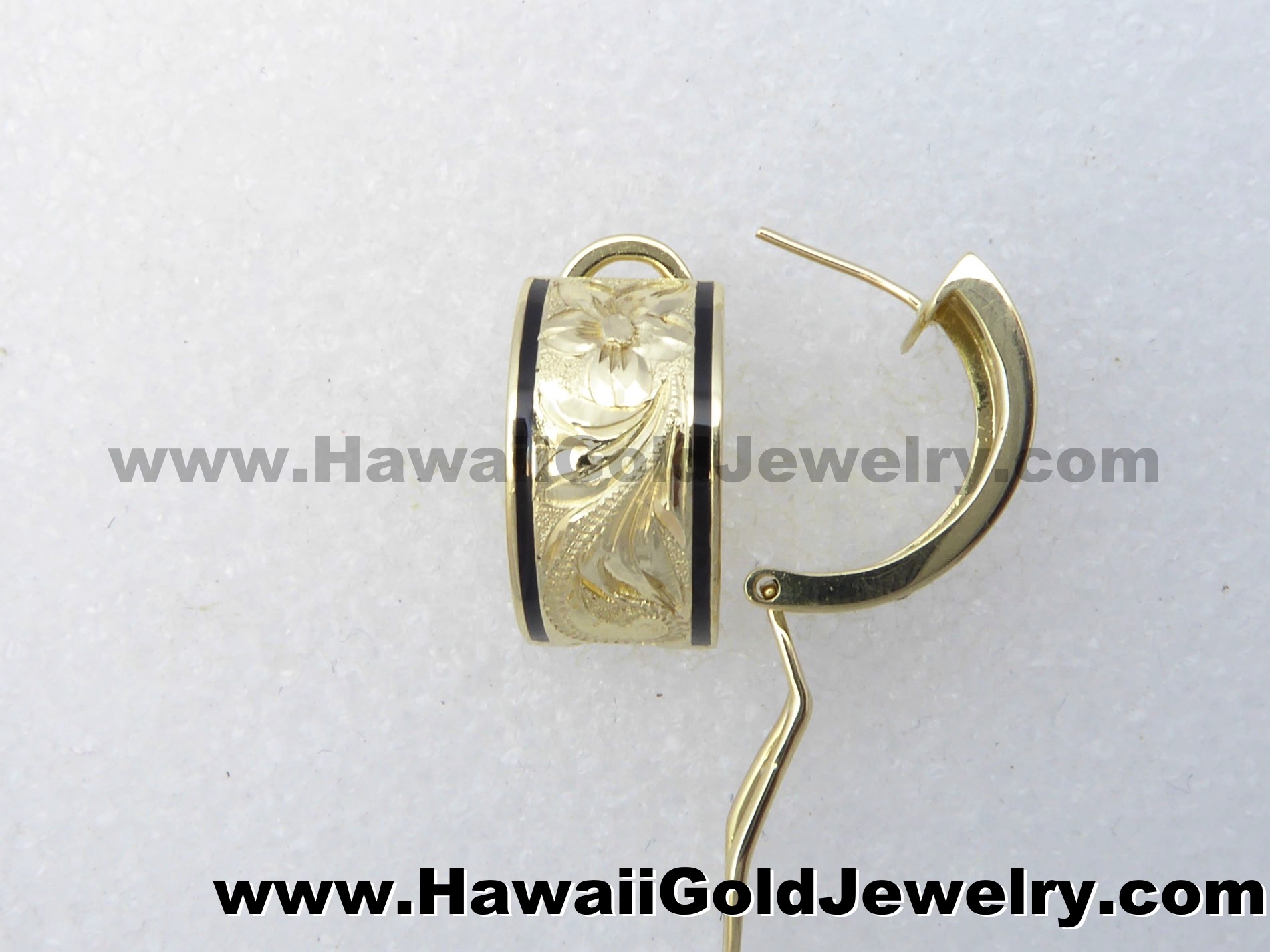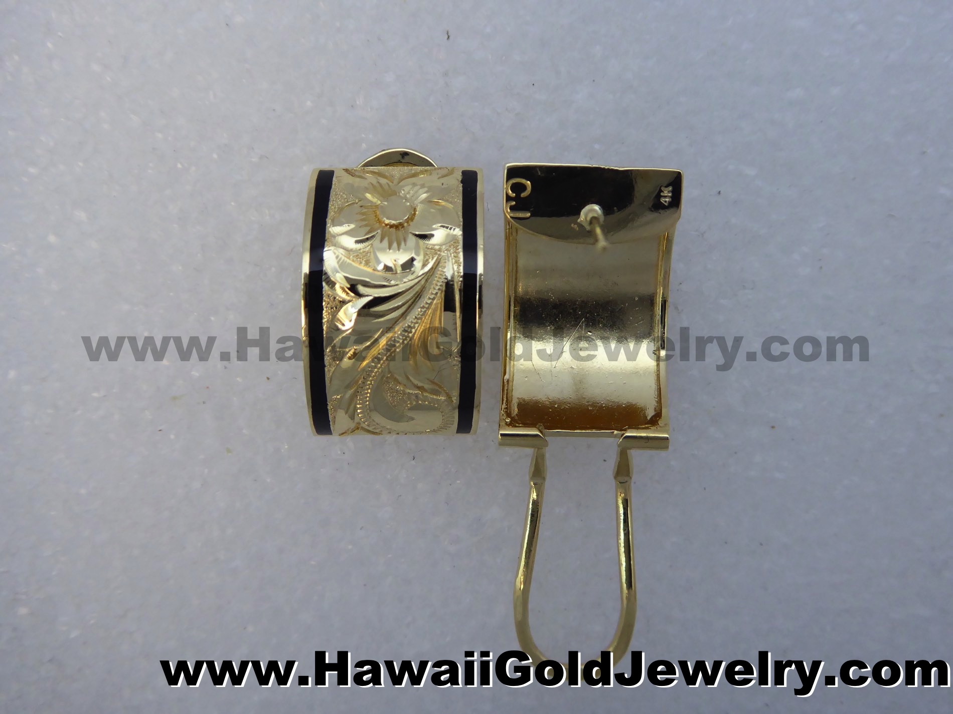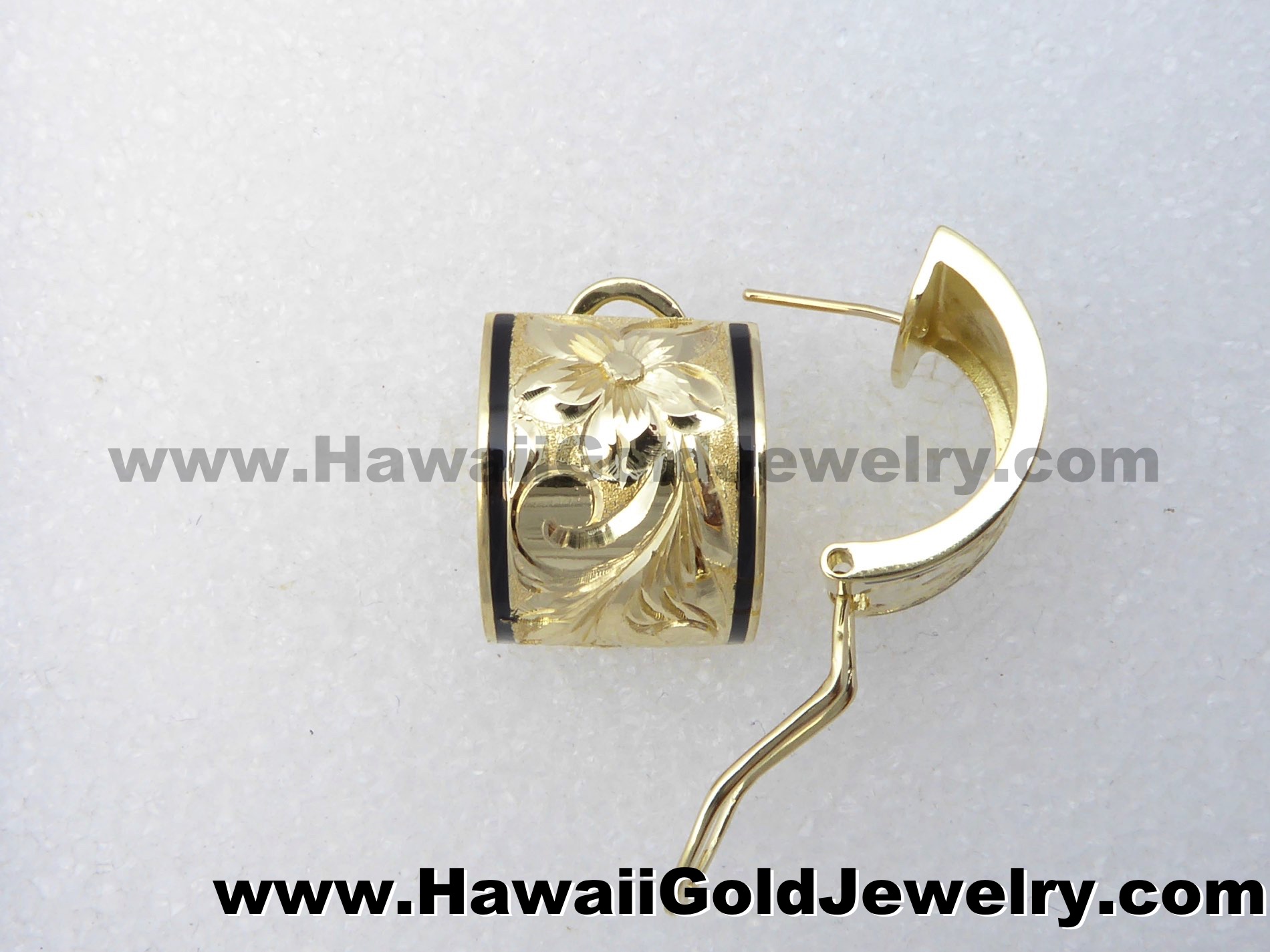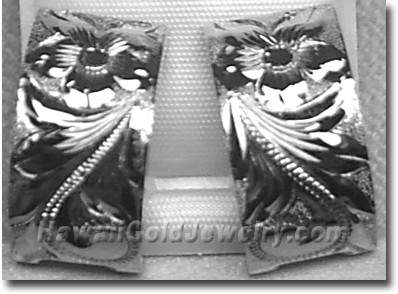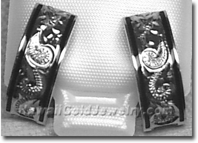 Design: Hand Engraved Plumeria Flower With Hawaiian Scroll and Leaves Metal: 14K Yellow Gold Frame: Plain or Black Border Features: Clip, Post Width(s): 6mm, 8mm, 10mm, 12mm, 15mm Dimensions: 6x16mm, 8x18mm, 10x19mm, 12x20mm, 15x20mm Shopping Cart Below Using Safe/Secure PayPal™